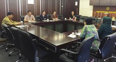 【本报讯】11月18日下午,印度尼西亚大学国际部主任 Melda Kamil Ariadno 教授、国际合作交流处处长Sisilia Setiawati Halimi博士在印尼大学行政楼会议室会见了广东外语外贸大学副校长何传添教授、21世纪海上丝绸之路协同创新中心秘书长李青教授、广东外语外贸大学印尼语专业蔡金城教授、宝鹰集团监事会胡兰萍主席和宝鹰集团古朴副总裁等,双方就共同培养中印尼国际人才学者、携手推进两国人才文化交流以及加强与中国宝鹰集团、印尼宝鹰集团的校企合作等方面达成共识。