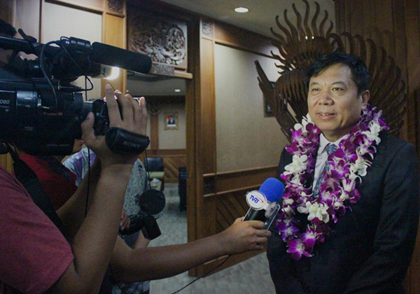 苟总领事对深夜前来迎接的领区各界人士表示感谢,与大家一一握手寒暄,合影留念。在接受印尼国家电视台、巴厘邮报等主流媒体采访时,苟总领事表示,巴厘岛是举世闻名的旅游胜地,中印尼合作交流前景广阔,希望在领区各界的支持下,继续增进中印尼人民友好情谊,深化两国各领域务实合作。