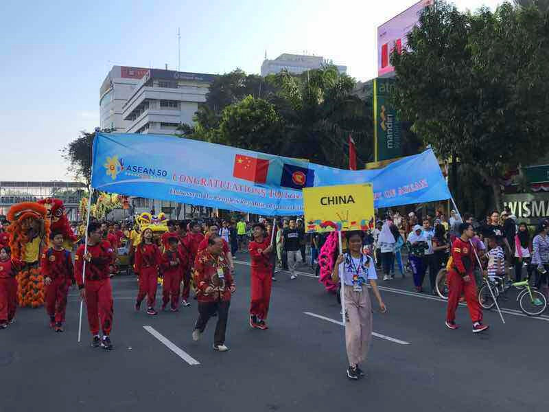 8月27日,应印尼外交部邀请,驻印尼使馆组织舞龙舞狮队参加在雅加达市中心举办的庆祝东盟成立50周年巡游活动。