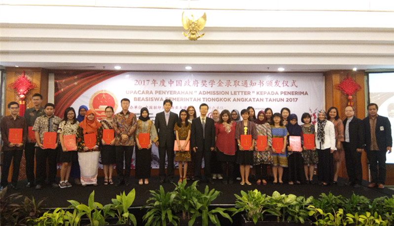 2017年8月21日,中国驻印尼大使馆在雅加达举办2017年度中国政府奖学金录取通知书颁发仪式,并为学生们赴华留学送行。215名中国政府奖学金获得者和家属,以及印尼教育界人士共400余人参加了仪式。