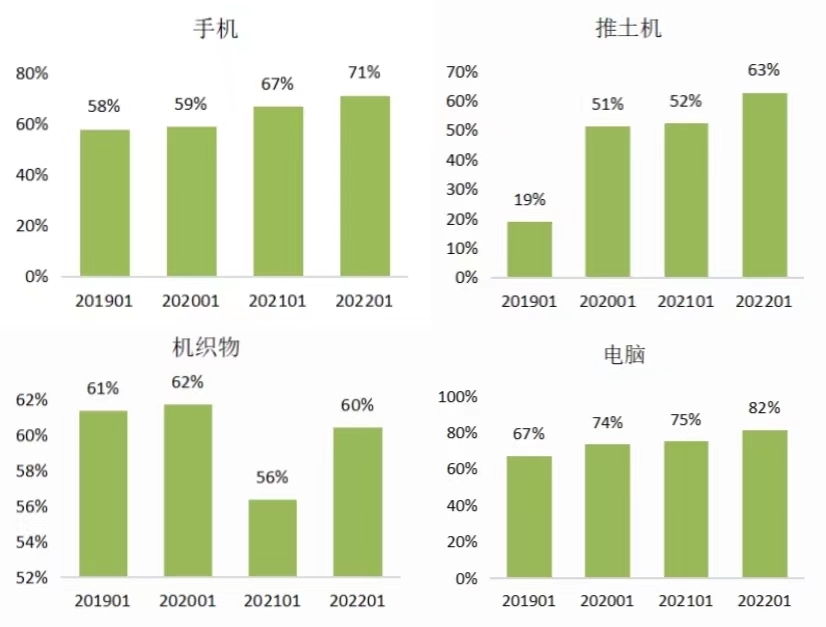 从进口依赖度来看,在前5大商品中印尼对中国手机、推土机、机织物、电脑的进口依赖度较高,一般超过60%,部分达到80%以下,详见下图9,且该状况持续时间较长。但另一方面,中国这些商品对印尼市场的依赖度并不高,出口占比多在1%~10%之间,其中推土机的出口在2022年以来有明显增长,占比达到了14%,今年1月有所下降,回到10%的水平, 2-3月的占比继续下滑到8%的水平。