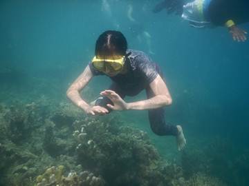 沐浴着柔和的海风,我们很快便到达了浮潜目的地。穿戴好装备之后,便下到海里进行期待已久的浮潜活动。因为有救生衣,不会游泳的我也可以很安全地浮在水面上,但由于海浪的作用,还是会时不时地喝上几口咸咸的海水。在海里适应了一阵子之后,我戴上眼罩,大胆地把头伸进水里尽情欣赏美丽而又神秘的海底世界。形状各异的珊瑚礁石静静地躺在海底,五颜六色的小鱼就在眼前穿梭而过,一切都触手可及,却又不敢真正去触碰,怕破坏了这如此和谐美好的画面。此情此景,静静地观看便已经是最大的享受。