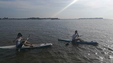 去到预订好的民宿稍加休整之后便迫不及待地开始了为期两天的海岛之旅。在一位当地小哥哥的带领下,我们去到一片平静的海面划独木舟。独木舟只能容纳一个人,坐在上面就像坐在一块漂在水上的木板,非常考验平衡力,稍不留神就会掉落到水里。刚开始坐上去的时候,人随着小舟左右摇晃,我手里紧握着船桨,害怕得身体僵硬,不敢随便乱动,摇晃得厉害时更是惊慌失措地大声叫喊。后来,在有经验的小伙伴的帮助下我慢慢地掌握了划水的基本要领,整个人开始慢慢放松,小舟也变得平稳了。到最后,我已经可以轻松地在海面上任意划行。
