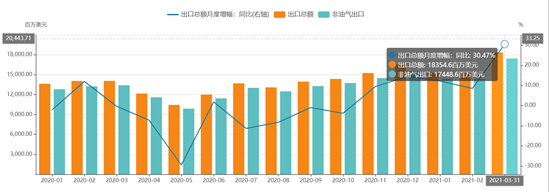 据印尼官方最近公布数据,2021年3月印尼出口显著恢复,单月出口金额达到自2012年以来自高水平,出口金额达到183亿美元,其中油气出口9亿美元,非油气出口174亿美元,环比增长20.31%,同比增长30.47%,已连续5个月出现正增长。