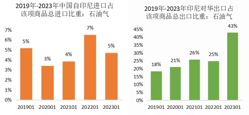 印尼是天然气资源和出口大国,中国是其主要出口市场,但出口波动性也较大。2023年1月,石油气及其他烃类气类(2711)出口中国的金额为3.7亿美元,占印尼该类商品全部出口的43%,上年同期为25%,其中90%是液化天然气LNG(271111)。但就中国而言,由于采取能源进口多元化政策,来自印尼的天然气进口仅仅占中国该类进口的一小部分,历年在3-7%之间,今年3月该比例下降到2%。