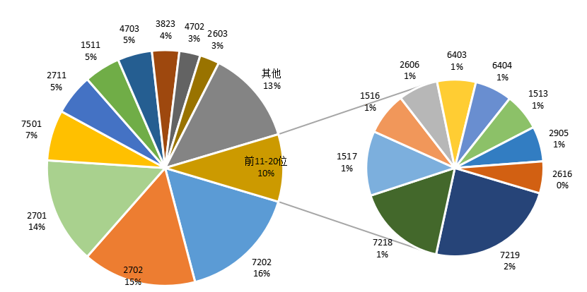 2023年1月,印尼自中国进口额最大的前20位商品占其进口总额比重仅为30%,其中前5位商品分别是手机(8517)、推土机(8429)、机织物(5407)、电脑(8471)以及平板显示器(8524),合计占比12%,总体上呈现出品类较为分散的特征(详见下图8和表7)。
